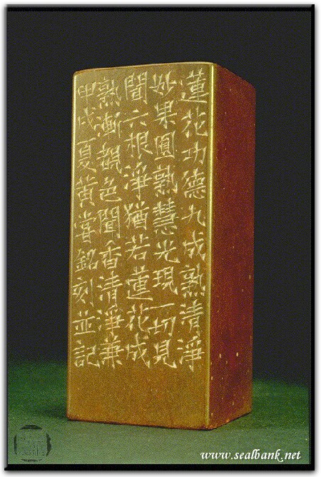 黃嘗銘.四十一歲/刻〔成熟清淨〕正方朱白文印。邊款為【蓮花功德九,成熟清淨。妙果圓熟慧光現,一切見聞六根淨,猶若蓮花成熟漸,睹色聞香清淨兼。甲戌夏,黃嘗銘刻並記。】蕭山石。