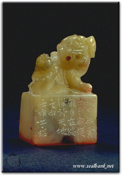 黃嘗銘.卅九歲/刻〔心安理得〕長方朱文印。邊款為【心中無貪無我執,便能自在徜徉於天地之中。壬申,子昭。】原印今藏於任容清。壽山石。
