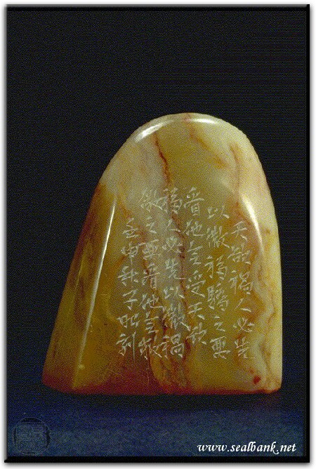 黃嘗銘.卅九歲/刻〔天福人先以微禍〕自然形朱文印。邊款為【天欲禍人,必先以微福驕之,要看他會受;天欲福人,必先以為禍儆之,要看他會救。壬申秋,子昭刻。】巴林凍。