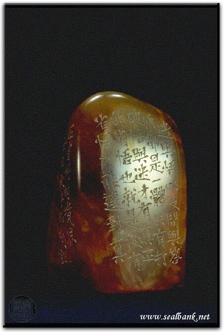 黃嘗銘.卅九歲/刻〔萬里無雲萬里天〕自然形朱文印。邊款為【迷與悟以及問與答,原都是一體,只有打破悟與迷,才有真正的省悟。也就是沒有省悟,才能達到真正省悟的境界。壬申秋,子昭刻記。】原印今藏於易淑貞。巴林凍。