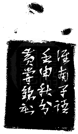 黃嘗銘.卅九歲/刻〔日慎一日〕正方白文界格印。邊款為【淮南子語。壬申秋分,黃嘗銘刻。】原印今藏於唐宗華。芙蓉石。