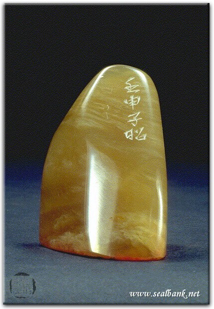 黃嘗銘.卅九歲/刻〔去留無意〕自然形朱文寬細邊印。邊款為【壬申,子昭。】原印今藏於吳淑婉。巴林凍。