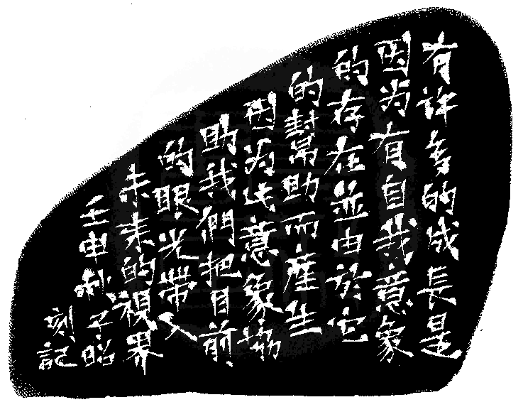 黃嘗銘.卅九歲/刻〔不止眼前〕自然形朱文印。邊款為【有許多的成長,是因為有自我意象的存在,並由於它的幫助而產生,因為此意象協助我們把目前的眼光帶入未來的眼界。壬申秋,子昭刻記。】原印今藏於連素香。巴林凍。