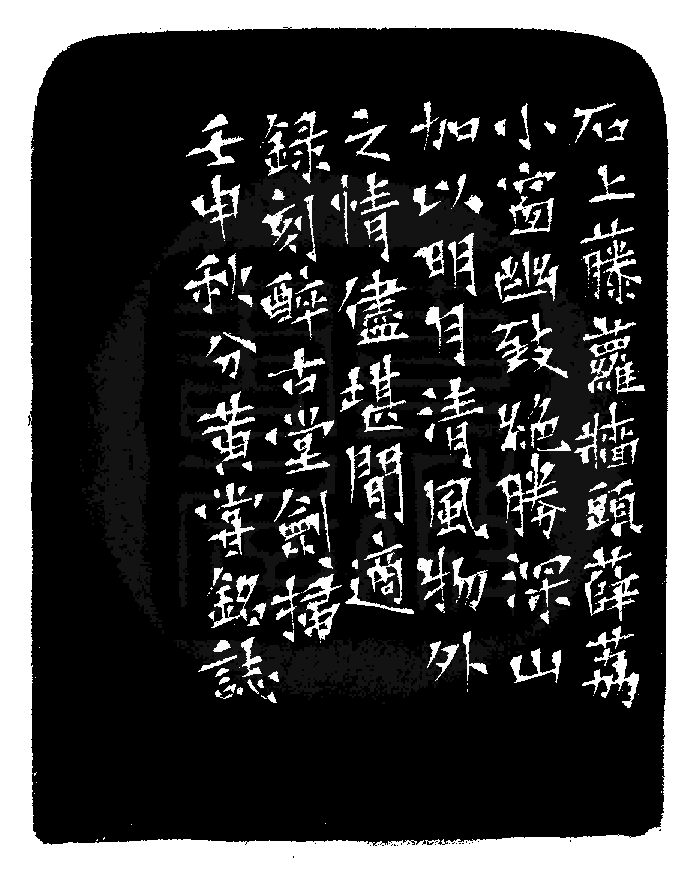 黃嘗銘.卅九歲/刻〔儘堪閒適〕長方朱文印。邊款為【石上藤羅,牆頭薛荔,小窗幽致,絕勝深山,加以明月清風,物外之情,儘堪閒適。錄刻醉古堂劍掃。壬申秋分,黃嘗銘誌。】原印今藏於陳鴻醴。泰來玳瑁石。