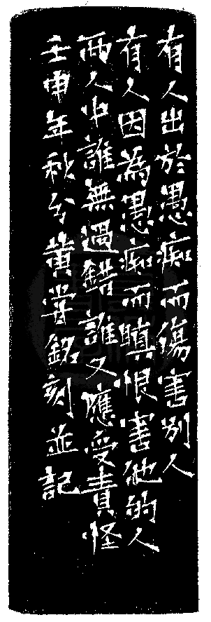 黃嘗銘.卅九歲/刻〔安忍除瞋〕正方加框白文印。邊款為【有人出於愚痴而傷害別人,有人因為愚痴而瞋恨害他的人,兩人中誰無過錯,誰又應受責怪。壬申年秋分,黃嘗銘刻並記。】巴林石。