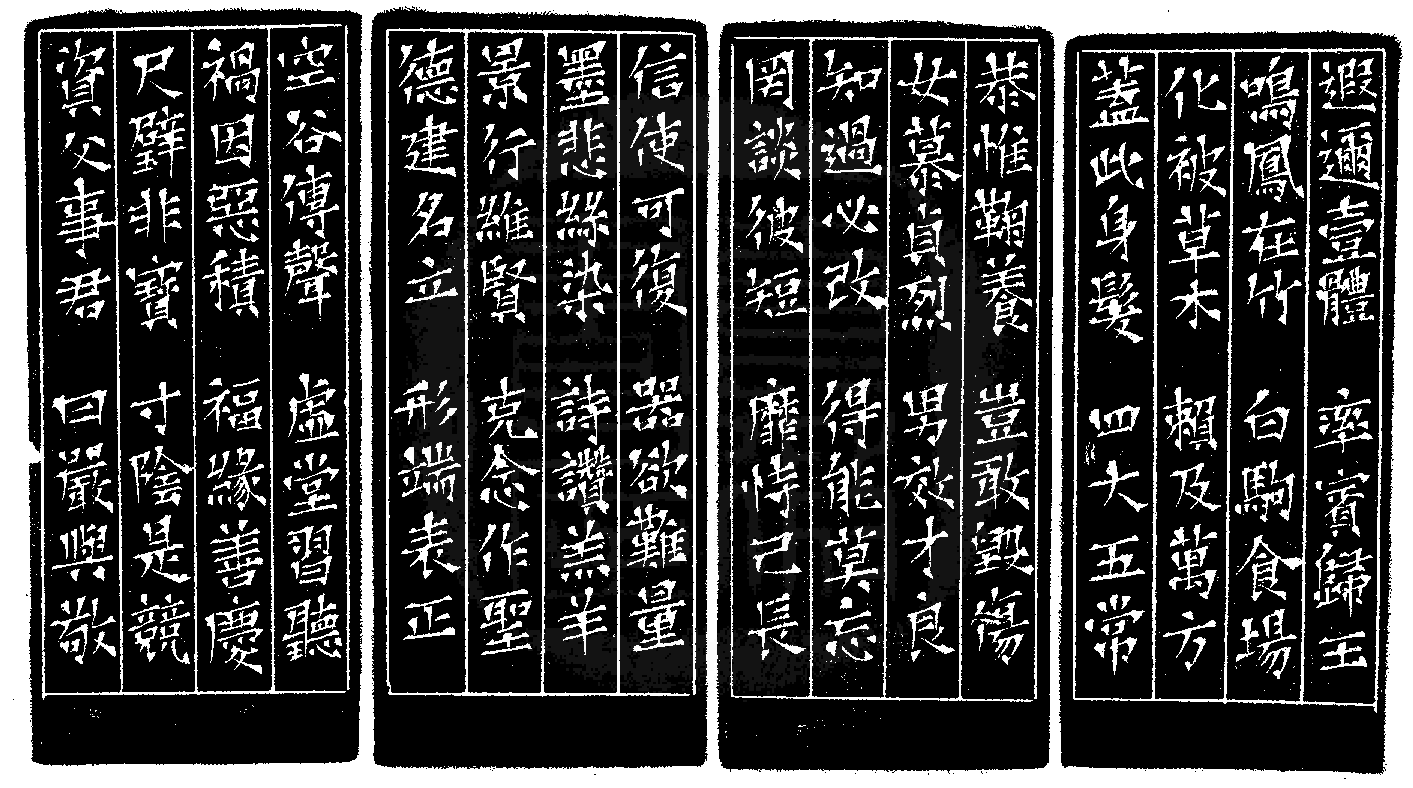 | | 印文:千金敝帚 | | 約 橫 2.9 X 豎 2.9 公分 印面圖 印石圖 | | 黃嘗銘.四十二歲/刻〔千金敝帚〕正方加框白文印。邊款為【遐邇壹體,率賓歸王,鳴鳳在竹,白駒食場,化被草木,賴及萬方,蓋此身髮,四大五常,恭惟鞠養,豈敢毀傷,女慕貞烈,男效才良,知過必改,得能莫忘,罔談彼短,靡恃己長,信使可復,器欲難量,墨悲絲染,詩讚羔羊,景行維賢,克念作聖,德建名立,形端表正,空谷傳聲,虛堂習聽,禍因惡積,福緣善慶,尺璧非寶,寸陰是競,資父事君,曰嚴與敬】巴林凍。 1995 年刻 |