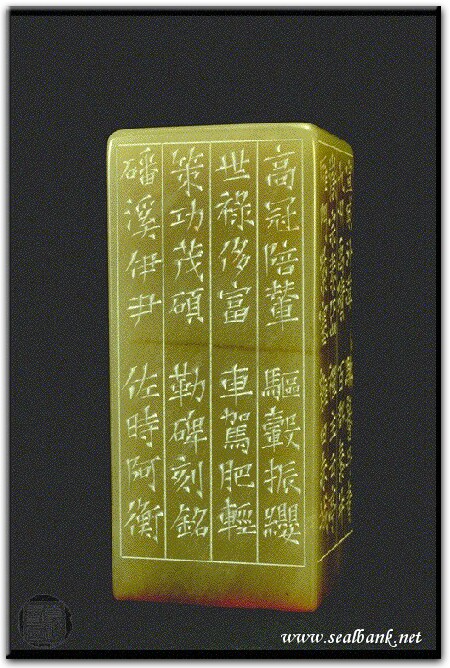 | | 印文:千金一刻 | | 約 橫 2.9 X 豎 2.9 公分 印面圖 邊款圖 | | 黃嘗銘.四十二歲/刻〔千金一刻〕正方朱文借邊印。邊款為【高冠陪輦,驅轂振纓,世祿侈富,車駕肥輕,策功茂碩,勒碑刻銘,磻溪伊尹,佐時阿衡,奄宅曲阜,微旦孰營,桓公匡合,濟弱扶傾,綺迴漢惠,說感武丁,俊乂密勿,多士實寧,晉楚更霸,趙魏困橫,假途滅虢,踐土會盟,何遵約法,韓弊煩刑,起翦頗牧,用軍最精,宣威沙漠,馳譽丹青,九州禹蹟,百郡秦并,嶽宗泰岱,禪主云亭,雁門紫塞,雞田赤城】巴林凍。 1995 年刻 |