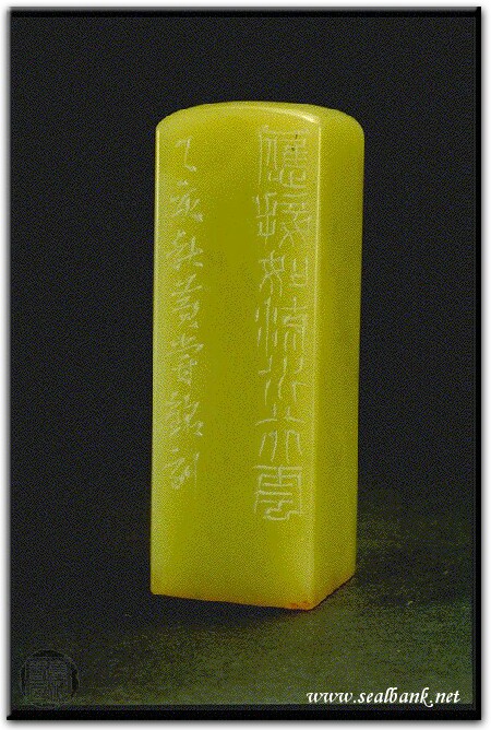 黃嘗銘.四十二歲/刻〔流水行雲〕正方朱白文印。邊款為【應接如流水行雲。乙亥秋,黃嘗銘刻。】原印今藏於蔡裕仁。青田凍。