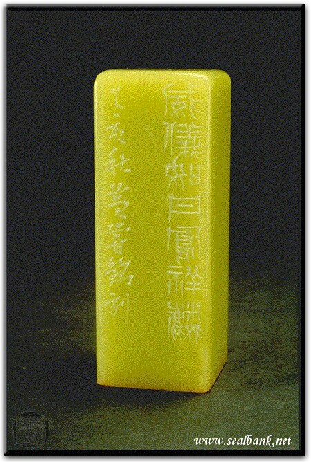 黃嘗銘.四十二歲/刻〔丹鳳祥麟〕正方朱文印。邊款為【威儀如丹鳳祥麟。乙亥秋,黃嘗銘刻。】原印今藏於蔡裕仁。青田凍。