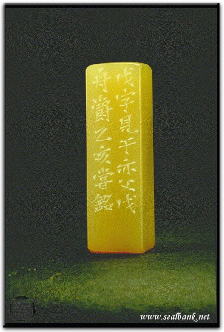 黃嘗銘.四十三歲/刻〔戊〕正方加框白文印。邊款為【戊字見于亦父戊舟爵。乙亥,嘗銘。】巴林凍。