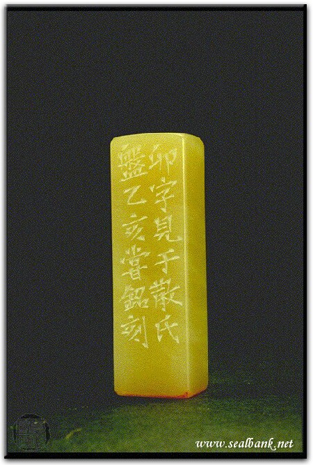 黃嘗銘.四十三歲/刻〔卯〕正方加框白文印。邊款為【卯字見于散氏盤。乙亥,嘗銘刻。】巴林凍。