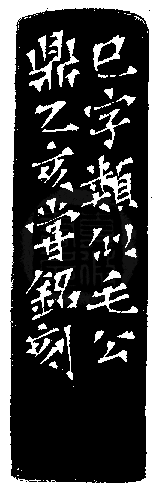 黃嘗銘.四十三歲/刻〔巳〕正方加框白文印。邊款為【巳字類似毛公鼎。乙亥,嘗銘刻。】巴林凍。