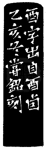 黃嘗銘.四十三歲/刻〔酉〕正方加框白文印。邊款為【酉字出自酉卣。乙亥冬,嘗銘刻。】巴林凍。