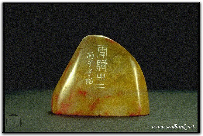 黃嘗銘.四十三歲/刻〔白玉雖白空守貞兮〕自然形朱文印。邊款為【雪賦之二。丙子,子昭。】昌化雞血。