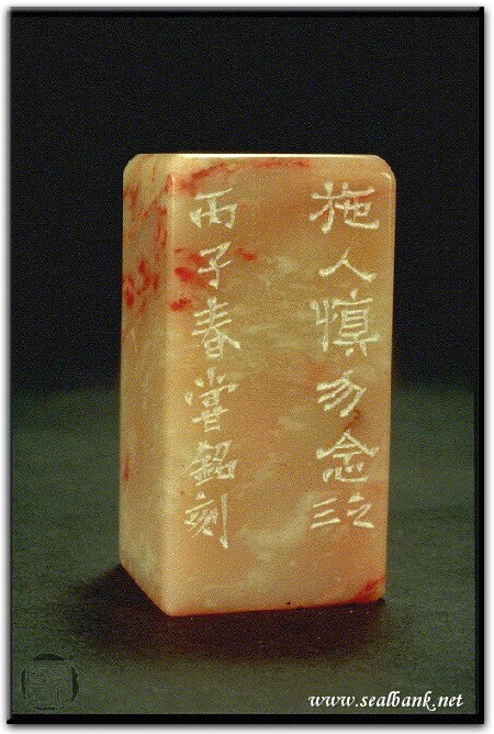 黃嘗銘.四十三歲/刻〔施人慎勿念〕正方朱文借邊印。邊款為【施人慎勿念。之三。丙子春,嘗銘刻。】巴林雞血。