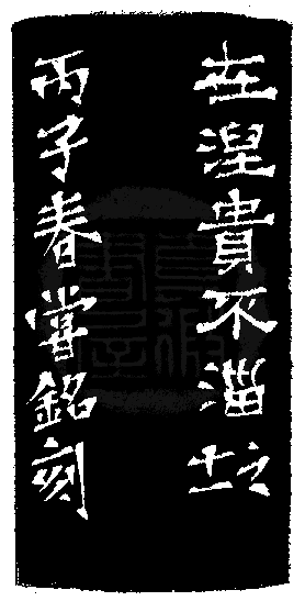 黃嘗銘.四十三歲/刻〔在涅貴不淄〕正方朱文印。邊款為【在涅貴不淄。之十一。丙子春,嘗銘刻。】巴林雞血。