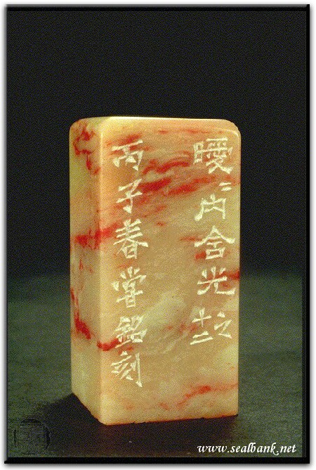 黃嘗銘.四十三歲/刻〔曖曖內含光〕正方朱文縱格印。邊款為【曖曖內含光。之十二。丙子春,嘗銘刻。】巴林雞血。