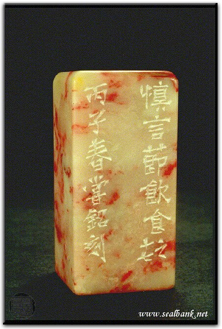 黃嘗銘.四十三歲/刻〔慎言節飲食〕正方朱文印。邊款為【慎言節飲食。之十七。丙子春,嘗銘刻。】巴林雞血。