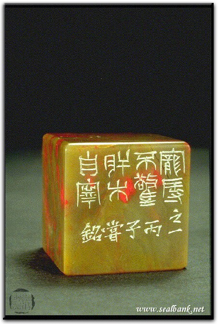 黃嘗銘.四十三歲/刻〔寵辱不驚〕正方朱文借邊印。邊款為【寵辱不驚,肝木自寧。之一。丙子,嘗銘。】原印今藏於石汝銘。昌化雞血。