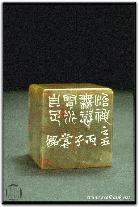 黃嘗銘.四十三歲/刻〔怡神無慾〕正方粗朱文印。邊款為【怡神無慾,腎水自足。之五。丙子,嘗銘。】原印今藏於石汝銘。昌化雞血。