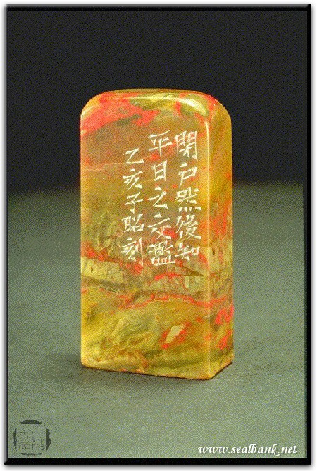 黃嘗銘.四十二歲/刻〔閉戶〕長方白文印。邊款為【閉戶然後知平日之交濫。乙亥,子昭刻。】原印今藏於王治國。昌化雞血。