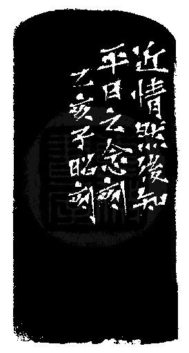 黃嘗銘.四十二歲/刻〔近情〕長方白文印。邊款為【近情然後知平日之念刻。乙亥,子昭刻。】原印今藏於王治國。昌化雞血。