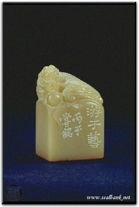 黃嘗銘.四十三歲/刻〔游於藝〕長方朱文印。邊款為【游于藝。丙子,嘗銘。】原印今藏於蔡行濤。壽山高山石。