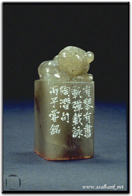 黃嘗銘.四十三歲/刻〔委懷琴書〕正方朱白文印。邊款為【有琴有書,載彈載詠。陶潛句。丙子,嘗銘。】壽山雞母窩。