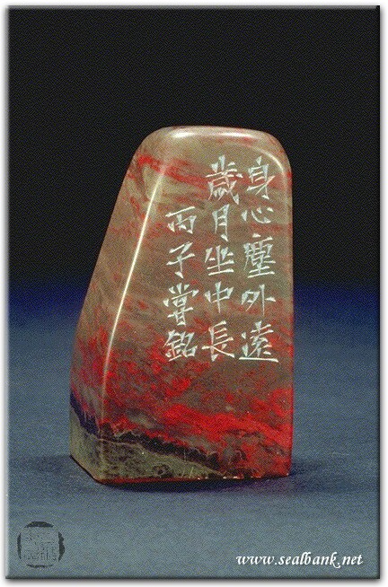 黃嘗銘.四十三歲/刻〔身心塵外〕長方白文印。邊款為【身心塵外遠,歲月坐中長。丙子,嘗銘。】原印今藏於解芮君。昌化雞血。