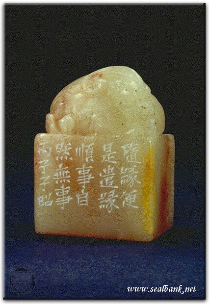 黃嘗銘.四十三歲/刻〔隨緣順事〕長方朱文借邊印。邊款為【隨緣便是遣緣,順事自然無事。丙子,子昭。】原印今藏於黃瑞柔。芙蓉石。