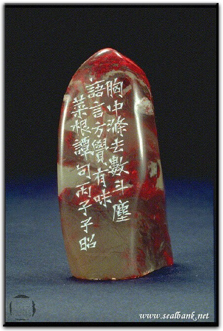黃嘗銘.四十三歲/刻〔滌塵〕自然形朱文借邊印。邊款為【胸中滌去數斗塵,語言方覺有味。菜根譚句。丙子,子昭。】原印今藏於王志國。昌化雞血。