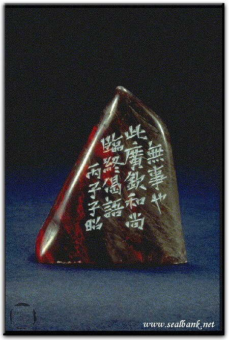 黃嘗銘.四十三歲/刻〔無代誌〕自然形封泥框朱文印。邊款為【無事也。此廣欽和尚臨終偈語。丙子,子昭。】原印今藏於郭基旺。昌化雞血。
