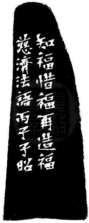 黃嘗銘.四十三歲/刻〔惜福〕自然形朱文印。邊款為【知福惜福再造福。慈濟法語。丙子,子昭。】原印今藏於陳美安。壽山旗降石。