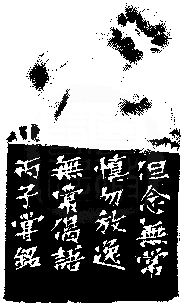 黃嘗銘.四十三歲/刻〔但念無常〕長方朱文借邊印。邊款為【但念無常,慎勿放逸。無常偈語。丙子,嘗銘。】芙蓉石。