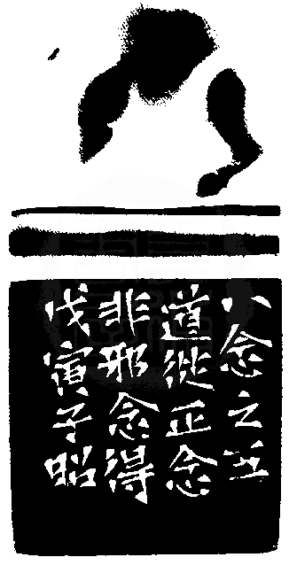 黃嘗銘.四十五歲/刻〔正念〕長方加框白文印。邊款為【八念之五,道從正念,非邪念得。戊寅,子昭。】江西石。