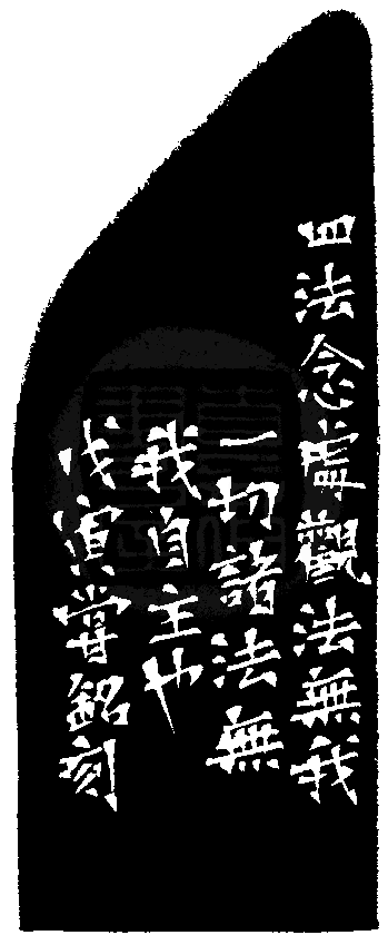 黃嘗銘.四十五歲/刻〔觀法無我〕正方白文印。邊款為【四法念處,觀法無我,一切諸法,無我自主也。戊寅,嘗銘刻。】昌化雞血。