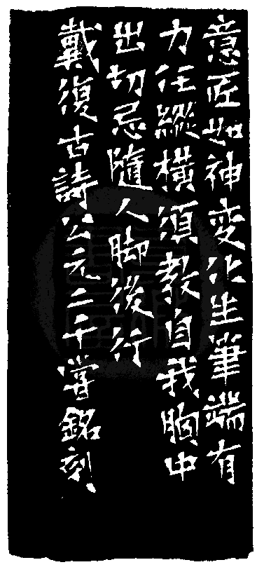 黃嘗銘.四十七歲/刻〔自我胸中出〕正方朱文借邊印。邊款為【意匠如神變化生,筆端有力任縱橫,須教自我胸中出,切忌隨人腳後行。戴復古詩。公元二千,嘗銘刻。】江西石。