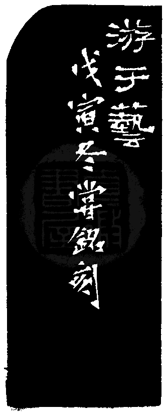 黃嘗銘.四十五歲/刻〔游于藝〕正方朱文印。邊款為【游于藝。戊寅冬,嘗銘刻。】原印今藏於逢甲大學。江西石。