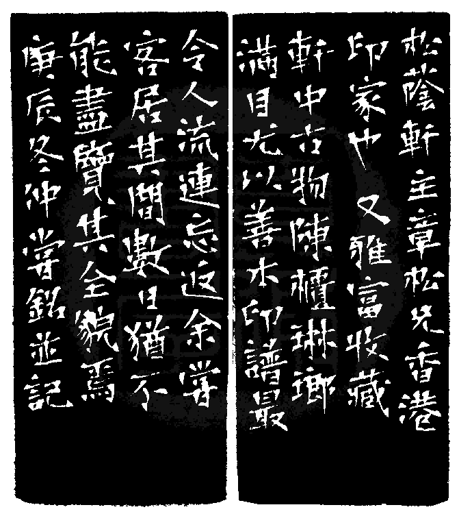 黃嘗銘.四十七歲/為林章松刻〔松蔭軒〕正方朱文印。邊款為【松蔭軒主章松兄,香港印家也,又雅富收藏,軒中古物陳櫃,琳瑯滿目,尤以善本印譜最令人流連忘返。余嘗客居其間數日,猶不能盡覽其全貌焉!庚辰冬仲,嘗銘並記。】江西石。