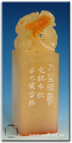 黃嘗銘.四十八歲/刻〔人主延壽〕正方細朱文印。邊款為【人主延壽。史記本記。辛巳,黃嘗銘。】壽山高山凍。
