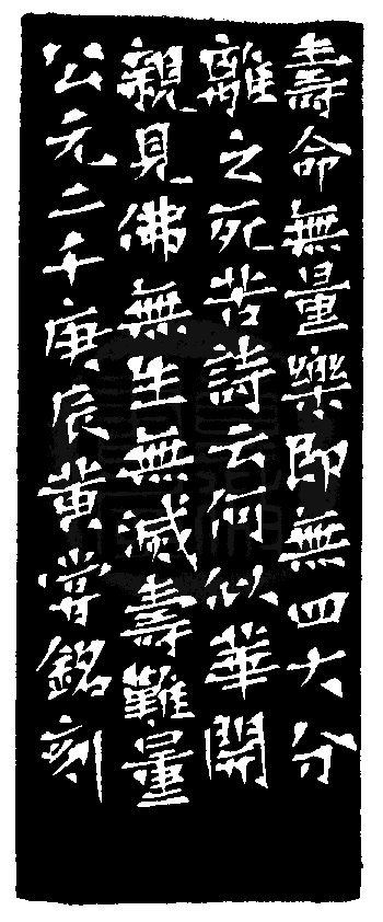 黃嘗銘.四十七歲/刻〔壽命無量〕正方朱文借邊印。邊款為【壽命無量樂,即無四大分離之死苦。詩云:何似華開親見佛,無生無滅壽難量。公元二千庚辰,黃嘗銘刻。】江西硯水凍。