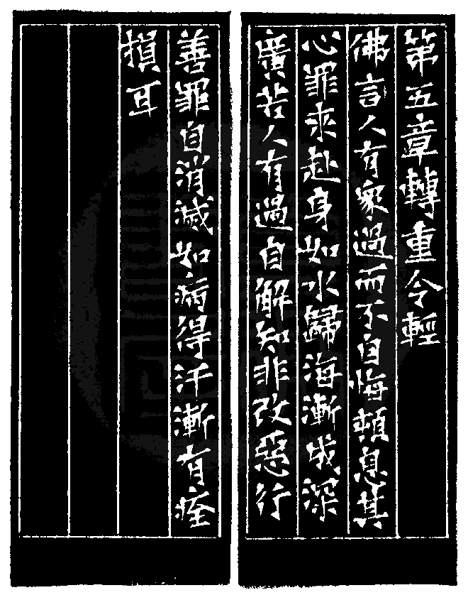黃嘗銘.四十五歲/刻〔轉重令輕〕正方粗朱文印。邊款為【第五章轉重令輕。佛言:人有眾過,而不自悔、頓息其心,罪來赴身;如水歸海,漸成深廣。若人有過,自解知非,改惡行善,罪自消滅;如病得汗,漸有痊損耳。】