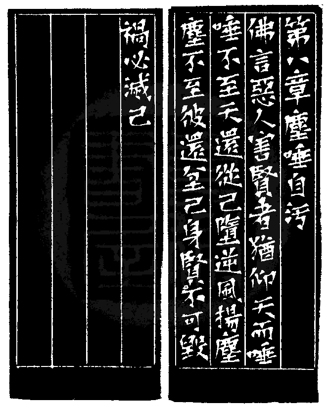 黃嘗銘.四十五歲/刻〔塵唾自污〕正方白文縱格印。邊款為【第八章塵唾自污。佛言:惡人害賢者,猶仰天而唾,唾不至天,還從已墮;逆風揚塵,塵不至彼,還坌己身。賢不可悔,禍必滅己。】