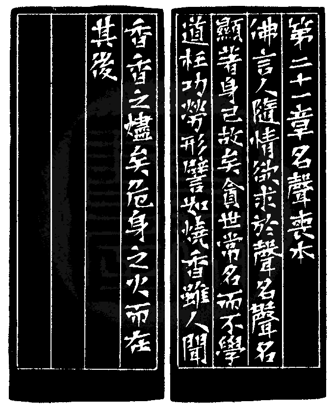 黃嘗銘.四十五歲/刻〔名聲喪本〕正方加框白文印。邊款為【第二十一章名聲喪本。佛言:人隨情欲,求於聲名;聲名顯著,身已故矣!貪世常名而不學道,枉功勞形。譬如燒香,雖人聞香,香之燼矣!危身之火,而在其後。】