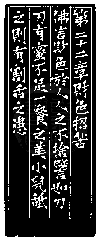 黃嘗銘.四十五歲/刻〔財色招苦〕正方滿白文印。邊款為【第二十二章財色招苦。佛言:財色於人,人之不捨。譬如刀刃有蜜,不足一餐之美;小兒舐之,則有割舌之患。】