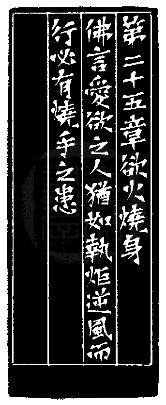 黃嘗銘.四十五歲/刻〔欲火燒身〕正方朱文印。邊款為【第二十五章欲火燒身。佛言:愛欲於人,猶如執炬逆風而行,必有燒手之患。】