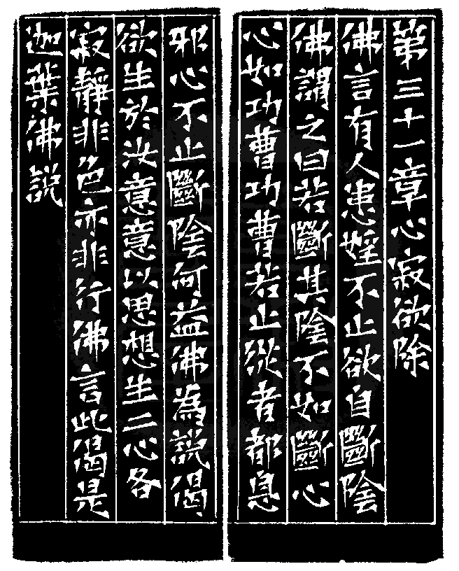 黃嘗銘.四十五歲/刻〔心寂欲除〕正方朱白文印。邊款為【第三十一章心寂欲除。佛言:有人患婬不止,欲自斷陰。佛謂之曰:若斷其陰,不如斷心。心如功曹,功曹若止,從者都息。邪心不止,斷陰何益?佛為說偈:欲生於汝意,意以思想生,二心各寂靜,非色亦非行。佛言:此偈是迦葉佛說。】