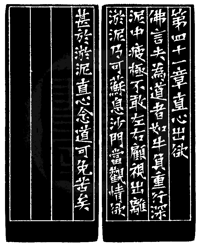 黃嘗銘.四十五歲/刻〔直心出欲〕正方白文界格印。邊款為【第四十一章直心出欲。佛言:夫為道者,如牛負重。行深泥中,疲極不敢左右顧視;出離淤泥,乃可蘇息。沙門當觀情欲,甚於淤泥。直心念道,可免苦矣。】