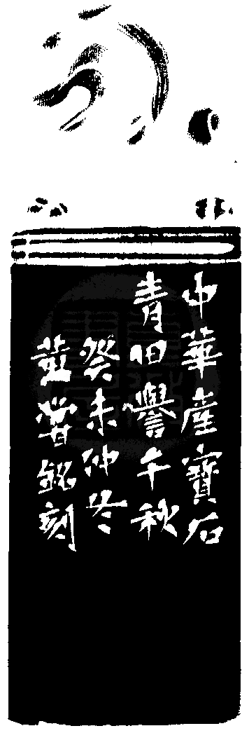 黃嘗銘.五十歲/刻〔中華寶石〕正方朱文借邊印。邊款為【中華產寶石,青田譽千秋。癸未仲冬,黃嘗銘刻。】青田石。獸鈕。