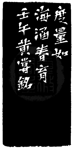 黃嘗銘.四十九歲/刻〔海涵春育〕正方白文印。邊款為【度量如海函春育。壬午,黃嘗銘。】江西石。